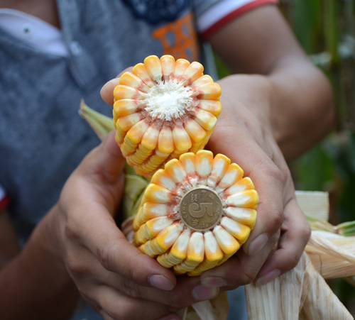 特征特性:該品種株型緊湊,幼苗葉鞘紫色,株高265-298厘米,穗位95-116厘米。平均生育期99-108天。果穗筒型,穗軸紅色,穗長18.5厘米,穗行數(shù)16-18行。籽粒黃色,馬齒型,千粒重354.0克,出籽率86.4%-90%。