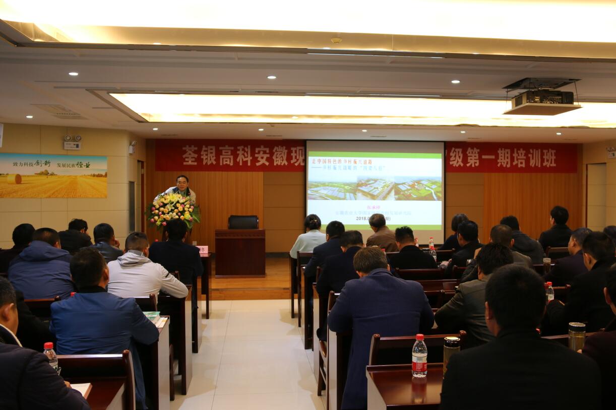 ? ? 本次培訓班由安徽省農委主辦、荃銀高科承辦,集中培訓時間為3月18日至22日,主要培訓課程有水稻規模生產管理技術、水稻育種及品種選用、社會化服務組織對接、小麥規模生產管理技術、新型職業農民職業素養、現代農業創業等。3月18日上午,安徽農業大學新農村發展研究院張承祥教授為學員開講“鄉村振興戰略”主題課。在學習培訓期間,除了理論課程,農場主學員們將于3月20日赴廬江郭河現代農業科技示范園進行參觀學習,開展實踐教學活動。