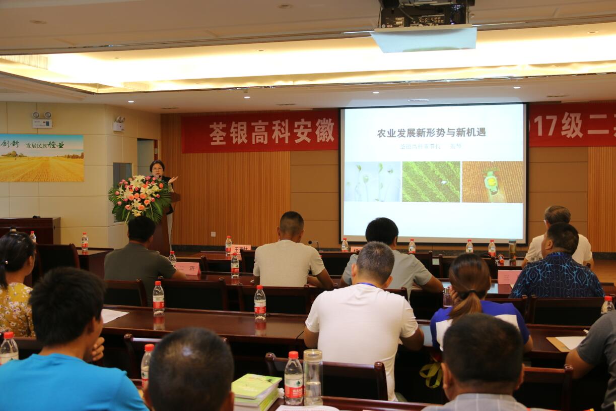 ??? 2018年7月19日,由安徽省農(nóng)委主辦、荃銀高科承辦的安徽現(xiàn)代青年農(nóng)場主培訓(xùn)2017級第二期培訓(xùn)活動在公司六樓多功能廳展開。安徽荃銀高科董事長張琴、營銷總監(jiān)王玉林,培訓(xùn)班總教務(wù)長楊惠成老師,安徽張海銀基金會秘書長張彤,及來自全省各地的100多位從事種植業(yè)的農(nóng)場主學(xué)員參加了培訓(xùn)。