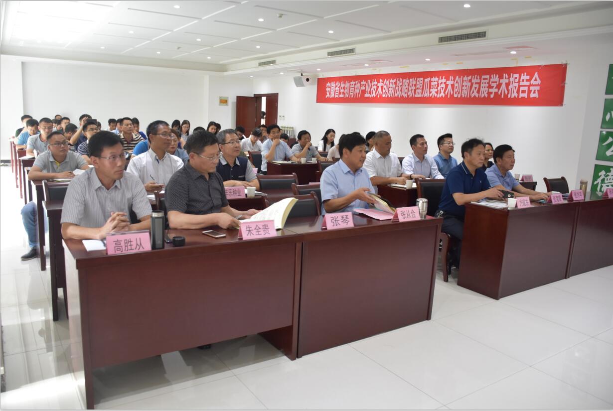 ??? 24日下午,安徽省生物育種產(chǎn)業(yè)技術(shù)創(chuàng)新戰(zhàn)略聯(lián)盟瓜菜技術(shù)創(chuàng)新發(fā)展學(xué)術(shù)報(bào)告會(huì)召開,合肥市科技局農(nóng)村與社會(huì)發(fā)展科技處處長方建東,安徽省蔬菜產(chǎn)業(yè)技術(shù)體系首席專家、國家西甜瓜產(chǎn)業(yè)技術(shù)體系合肥綜合試驗(yàn)站站長張其安研究員,豐樂種業(yè)、徽大農(nóng)業(yè)等安徽省生物育種產(chǎn)業(yè)技術(shù)創(chuàng)新戰(zhàn)略聯(lián)盟成員及員工70余人參加了報(bào)告會(huì)。